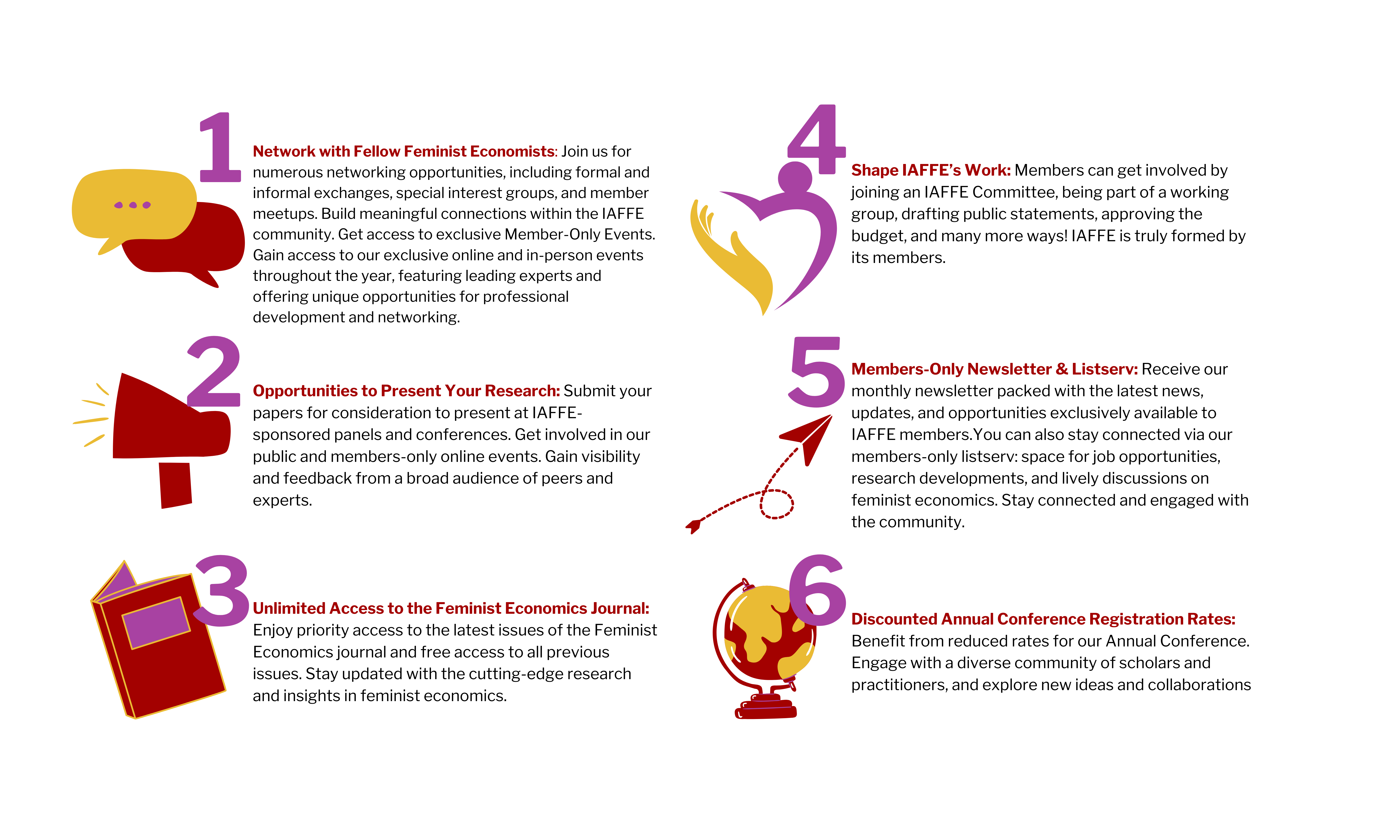Join IAFFE MembershipBy joining IAFFE, you are becoming part of an association dedicated to transforming economic thought and practice through a feminist lens. Our dynamic, inclusive, and global network of academics, policymakers, and activists supports the creation, development, and implementation of intersectional feminist economics to advance social justice, equality, and institutional transformation. We have a membership plan to suit different budgets. If you are able, you may also make a donation when joining, to contribute to IAFFE’s ability to support less-resourced members. Join Now!Member Pricing